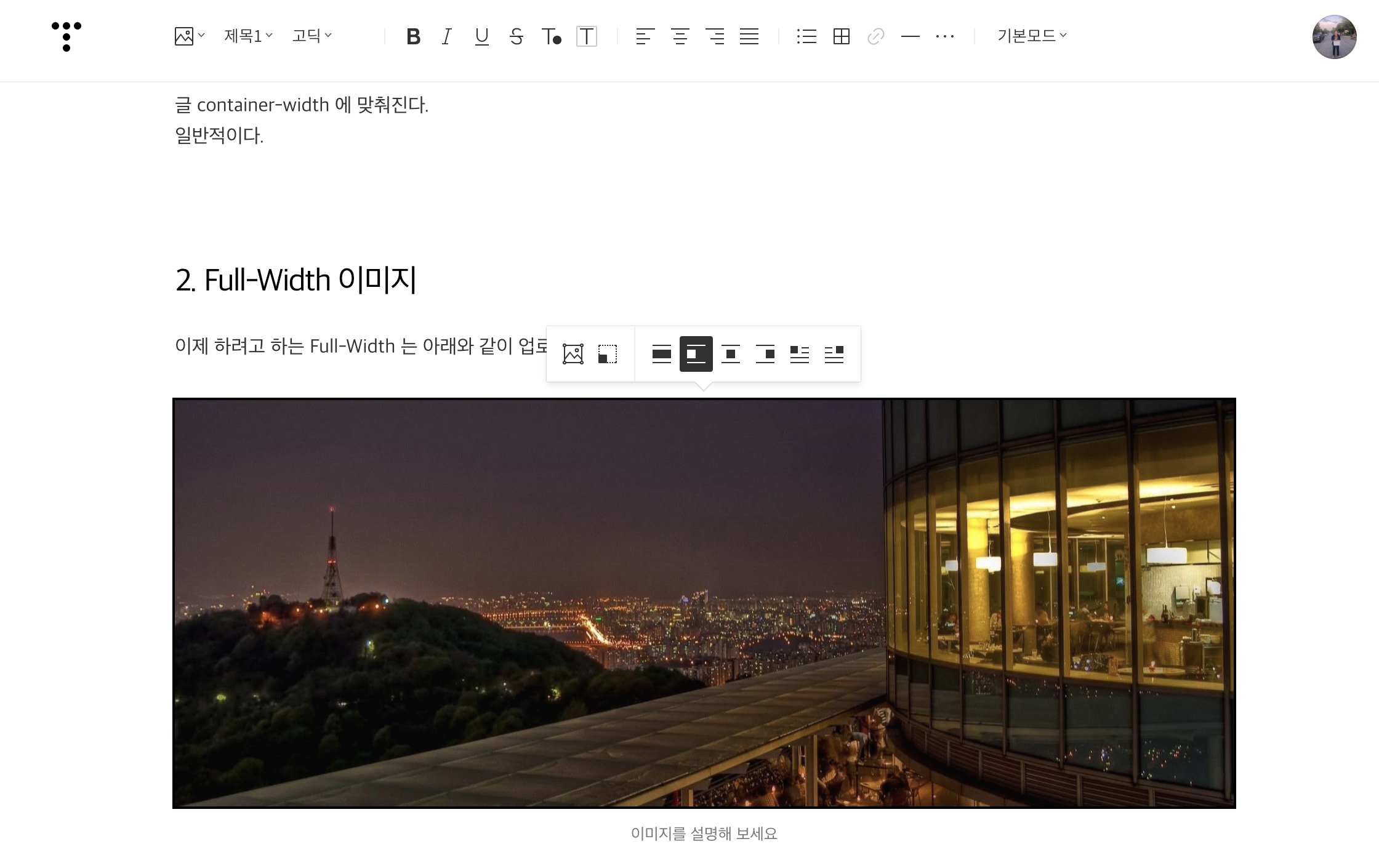 가장 맘에 들었던 부분은 Full-width image 를 브런치에서는 제공한다는건데, 좀 커다란 그림을 넣고싶을 때, 매우매우 유용하고 이쁘다.