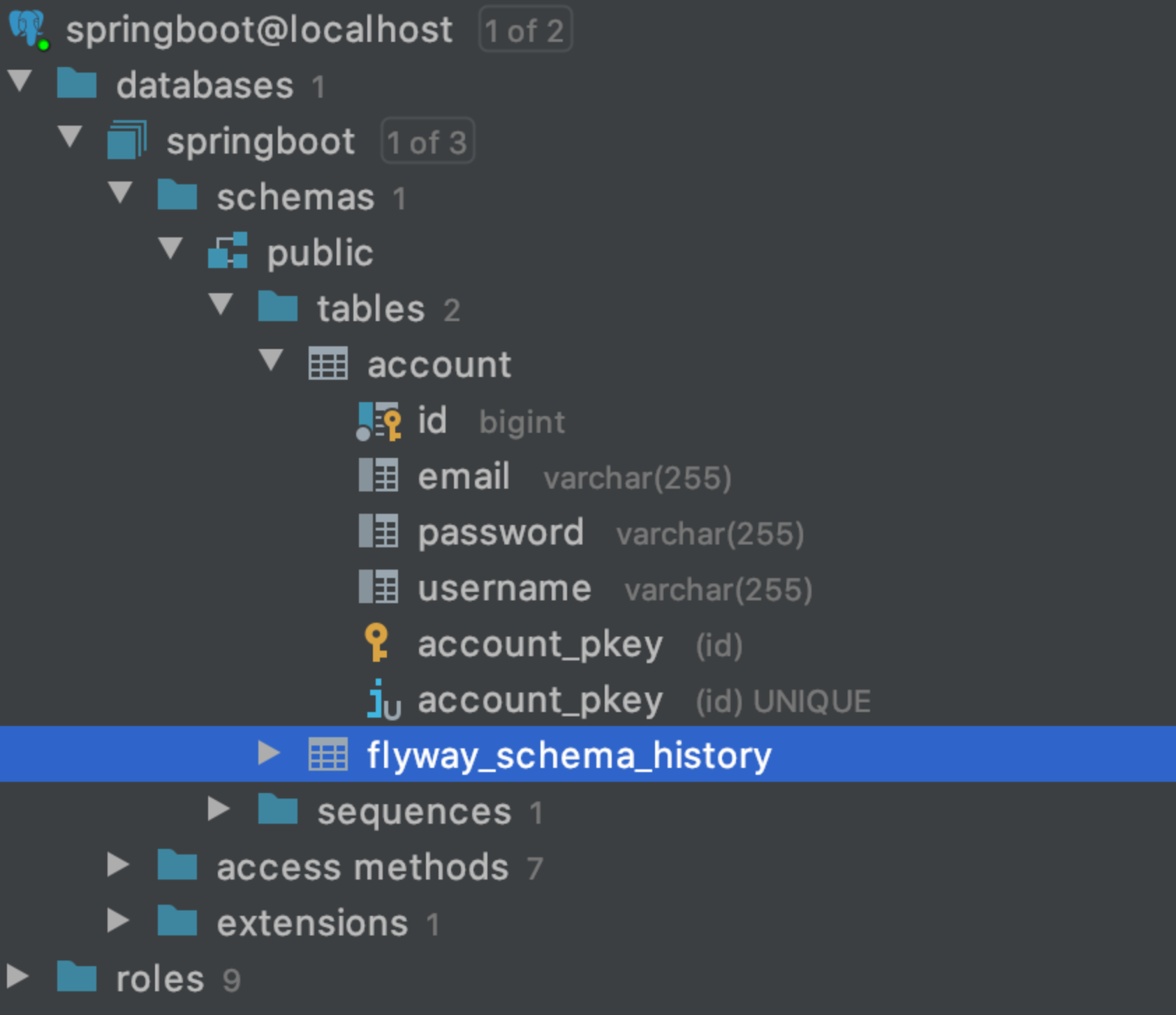 create table account (id bigint not null, email varchar(255), password varchar(255), username varchar(255), primary key (id));