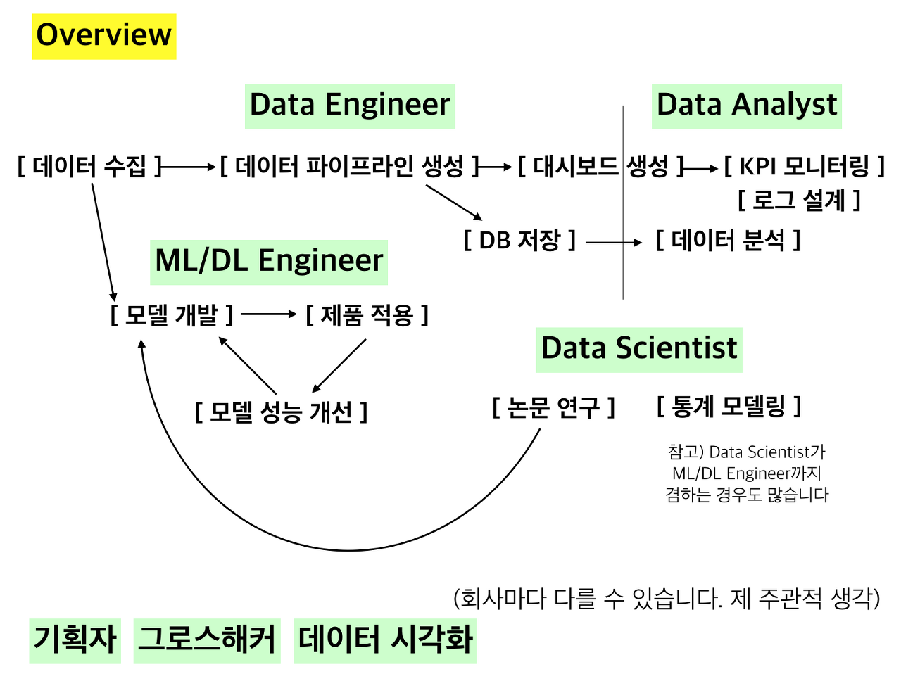 먼저 데이터 엔지니어를 말하기 전, 데이터 관련 직무가 뭐가 있는지, 어떤 일을 하는지 분리해서 알아야 한다.