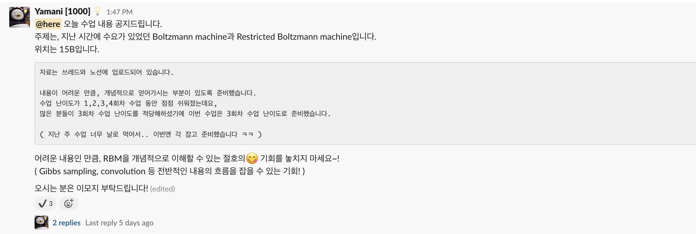 사전에 내 발표 자료 피드백을 마구마구 해주시는데, 덕분에 발표를 "그냥" 하는게 아니라 어떻게 해야 "잘할 지" 고민하고 실천해볼 수 있게 된다. 조금 힘들기는 하지만, 그래도 마구마구 성장하는 느낌? 이후에 또 발표해보고 싶다는 생각이 든다.