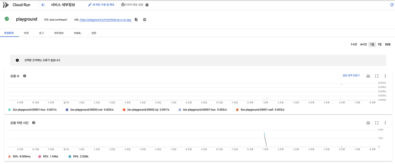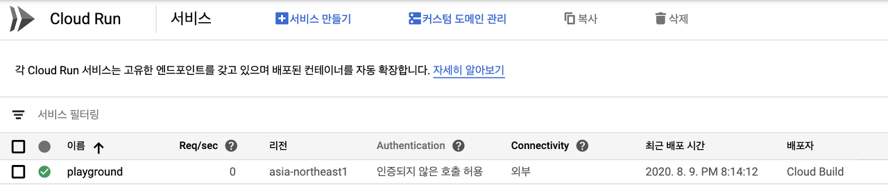 GCP - Cloud Run 에 가면 다음처럼 배포된 인스턴스가 생긴 것을 볼 수 있다.