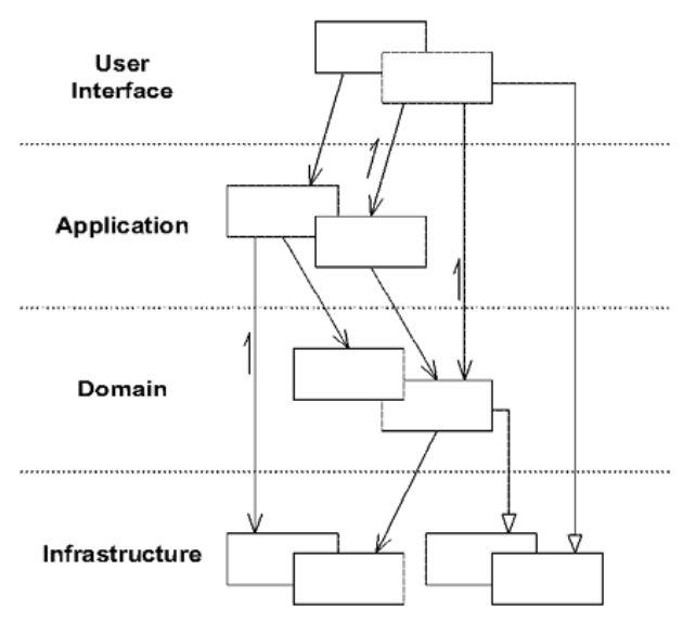 중요한 점은 의존성의 방향이 위에서 아래(프레젠테이션 -> 애플리케이션 -> 도메인)로 향하고 있다. 이 방향을 거스르는 의존은 허용되지 않는다. (도메인 -> 인프라스트럭처는 의존 관계가 아니라 추상화 -> 구현 관계가 일반적이다. 위 다이어그램에서는 도메인이 인프라스트럭쳐에 의존하는 화살표가 하나 보이는데, 현재는 자주 쓰이는 패턴은 아니라고 한다.)