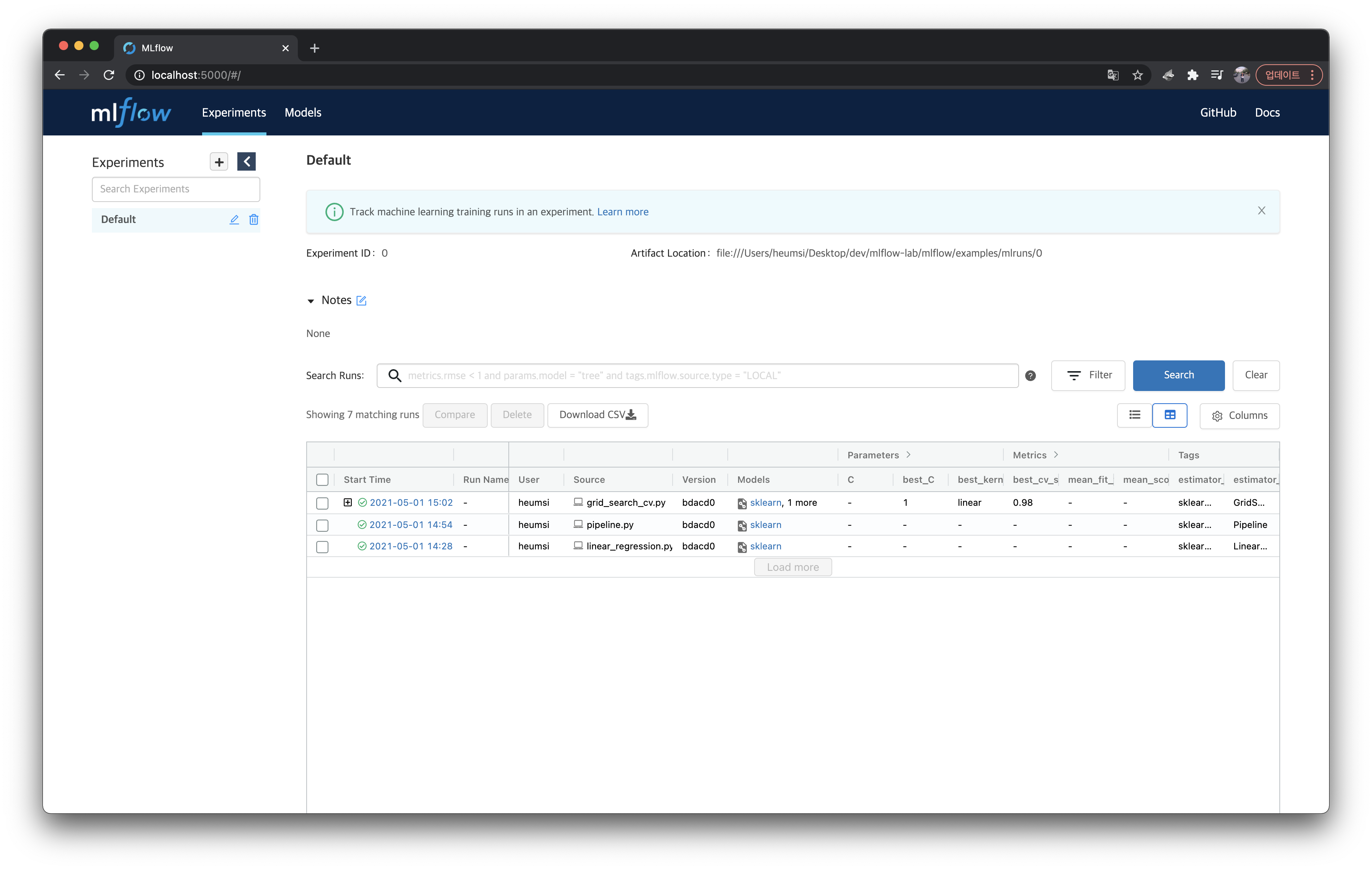 출력된 내용을 보면 크게 parent run 과 child runs 으로 구성해볼 수 있다.parent run 에서는 전체 파이프라인에 들어간 파라미터 값들을 기록하고, 또 이 GridSearch 를 통해 찾은 최적의 파라미터 값을 기록한다. (best_C, best_kernel ).child runs 에서는 GridSearch 진행할 때 각각 파라미터 경우의 수대로 run 들을 실행하고 기록한 모습을 볼 수 있다. 이 때 child runs 들도 각각 하나의 run 이 되므로 run_id 를 가지게 된다. 즉 GridSearch 에서 파라미터 조합의 경우의 수가 많아지면, 그만큼의 실행(run) 이 생기게 된다.