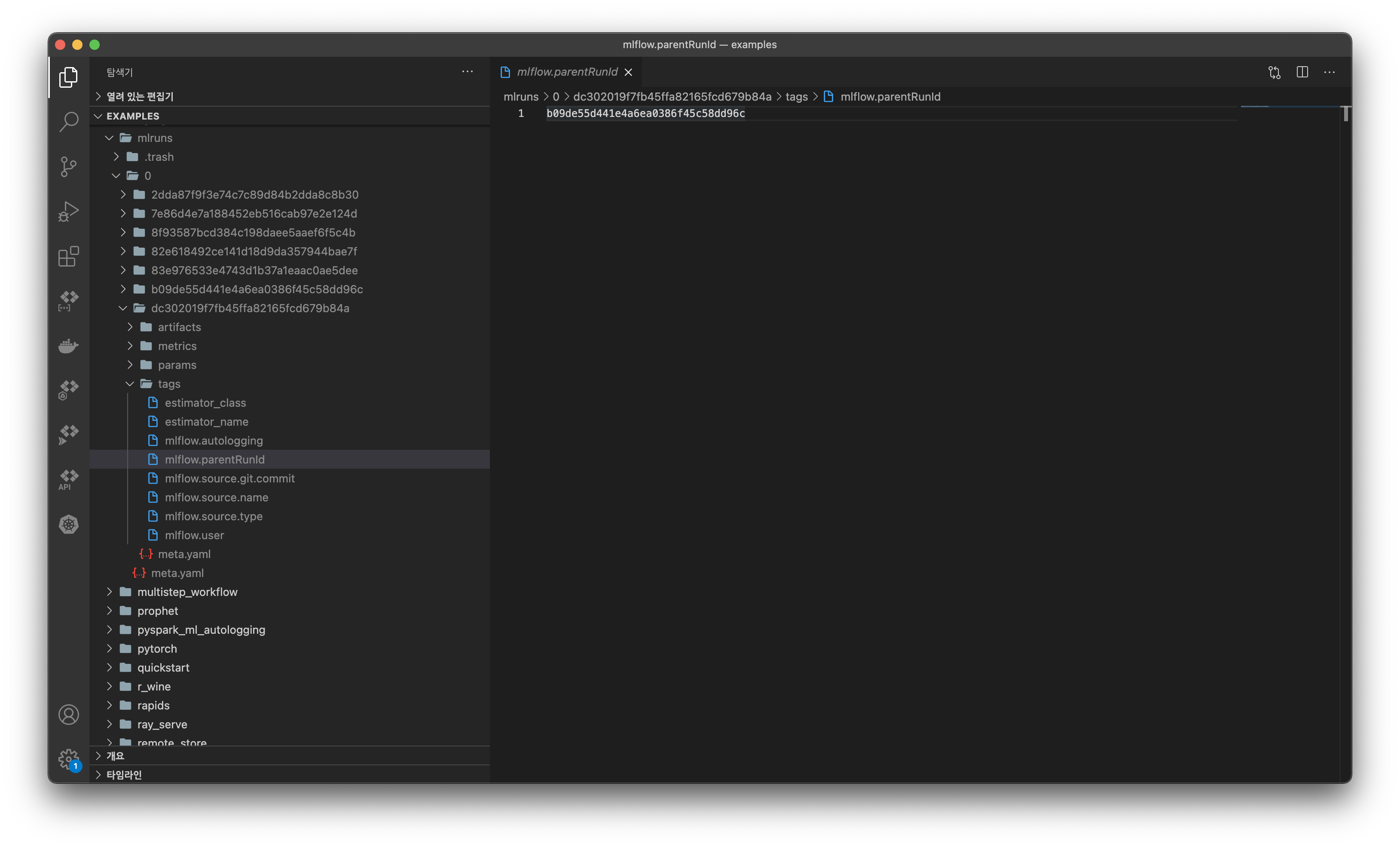그리고 이 파일에 위 사진처럼 부모 run_id 가 기록되어 있다. (b09de55d441e4a6ea0386f45c58dd96c 는 dc302019f7fb45ffa82165fcd679b84a 의 parent run 이다.)