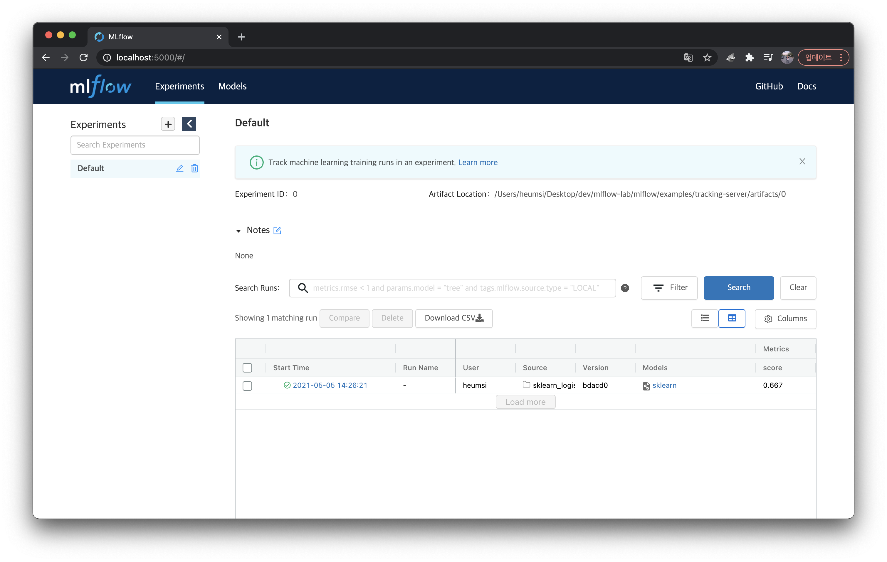 localhost:5000에 떠있는 Tracking Server를 사용했고, - Tracking Server 는 프로젝스 실행의 결과물들을