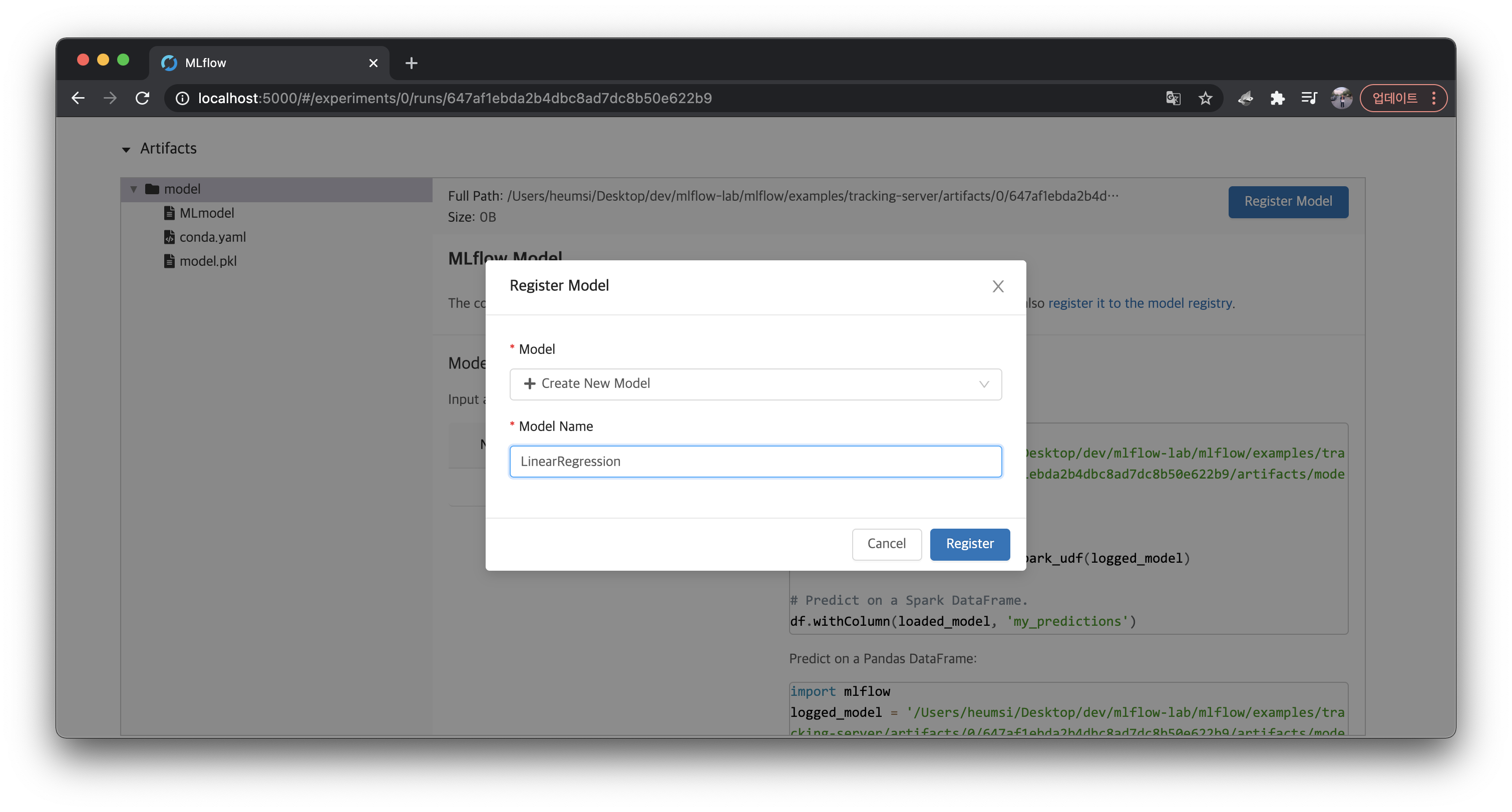바뀐 부분은 딱 한 줄이다. mlflow.sklearn.log_model 함수에 registered_model_name="LinearRegression" 인자를 추가하였다. (이 함수에 자세한 내용은 여기서 확인할 수 있다.)