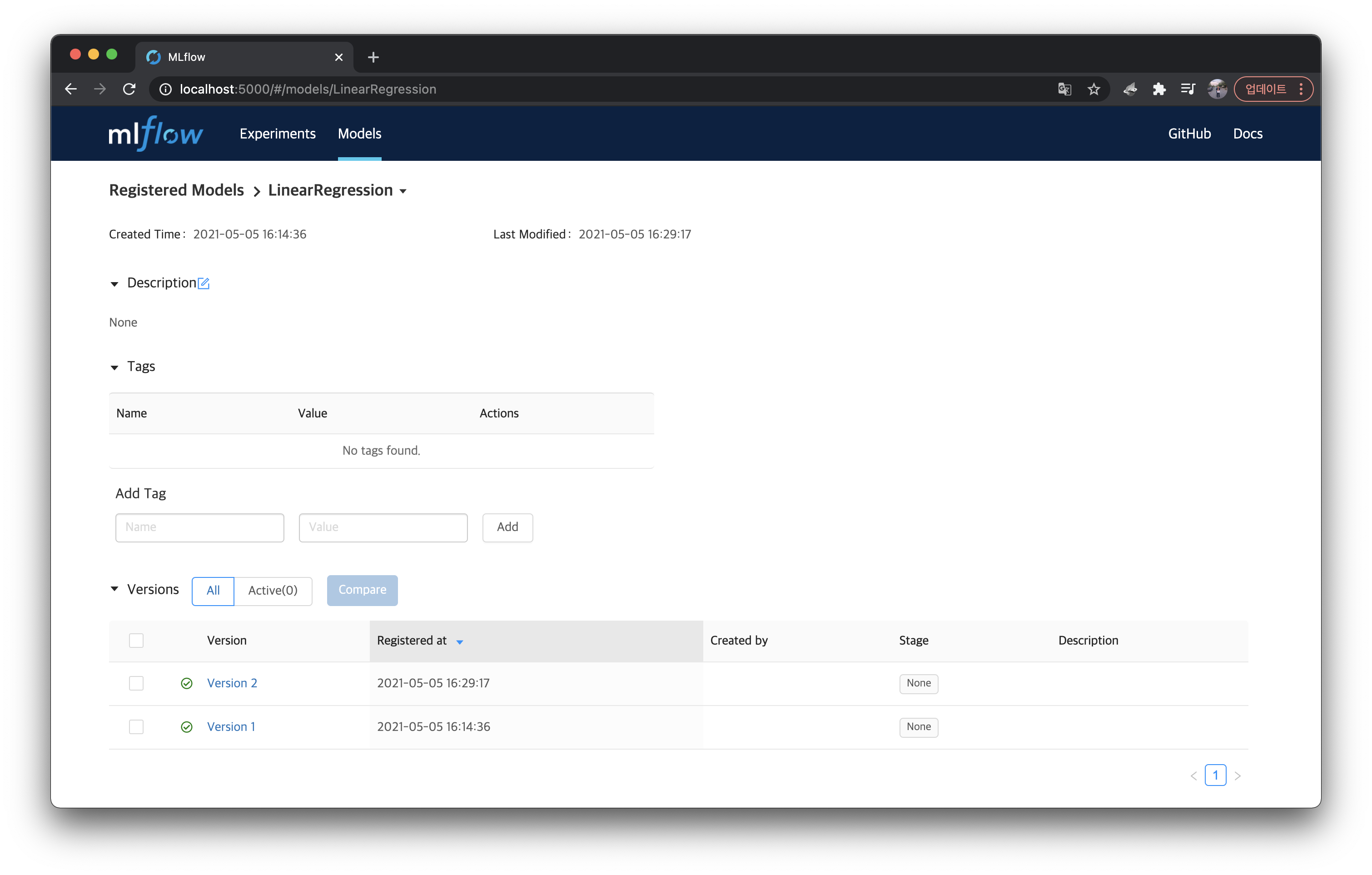 위처럼 LinearRegression 모델의 Latest VersionVersion 2 가 된 것을 볼 수 있고, 등록된 모델 상세 페이지에 들어가보면 아래처럼 Version 2 가 추가된 것을 볼 수 있다.