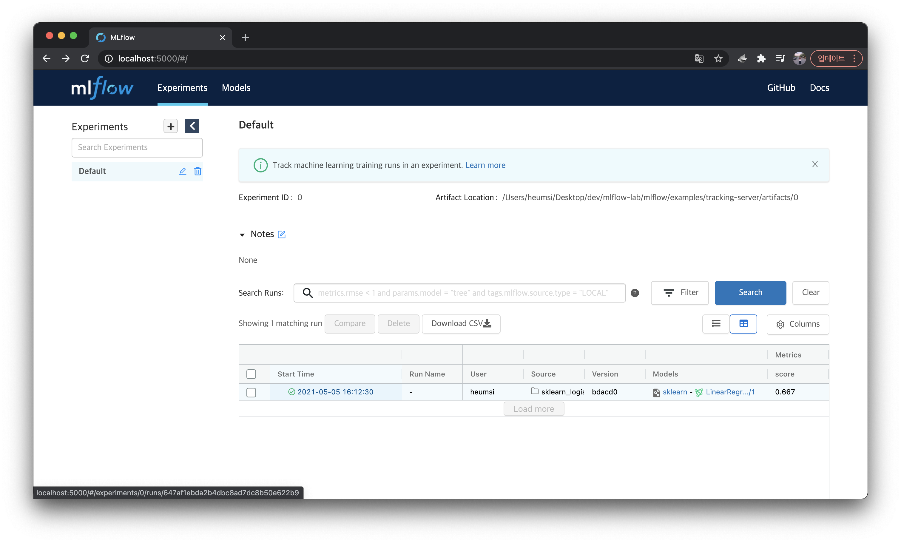 웹 서버 (Tracking Server) 에 들어간 뒤, 실행했던 실행(Run)을 클릭하여 들어간다.