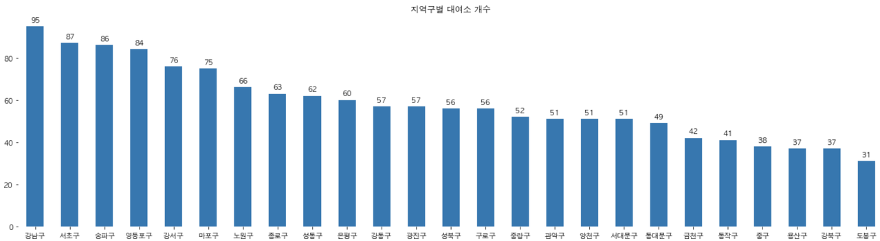 - 대여소의 개수는 강남3구와 강서지역(강서, 마포, 영등포)에 유독 많았고, 제일 적은 지역과 가장 많은 지역의 차이는 3배정도 난다.