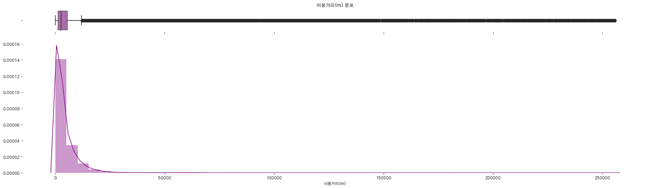 먼저 이용거리 전체 분포를 boxplot 과 distplot 으로 보자.