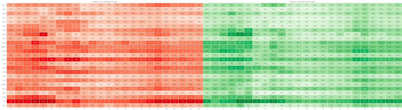 시간에 따른 각 지역별 (유입 - 유출비율) 히트맵. 빨간색은 유출이 압도함을, 초록색은 유입이 압도함을 의믜한다.