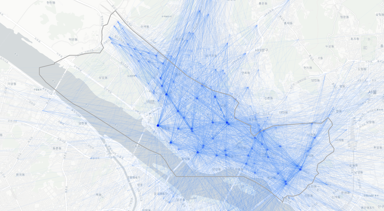 4. 해당 경로를 이용한 량은 선의 투명도로 표현한다. 즉 짙으면 이용량이 많다는 뜻이다.