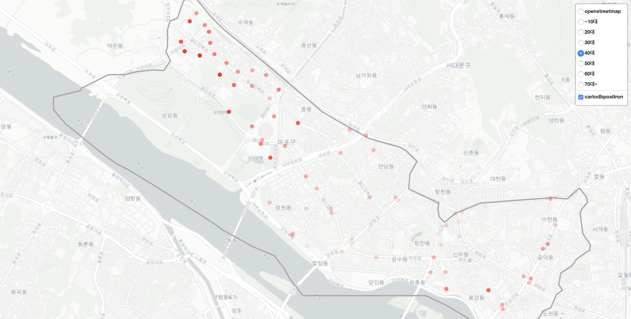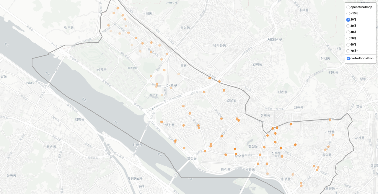 20대의 경우, 확연히 신수동, 상수동, 그리고 신촌 쪽에 이용 비율이 높은 것을 알 수 있다.