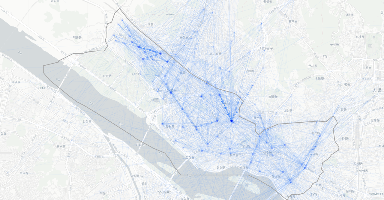 별다른 설명 없이, 위 시각화만 보고도, 출근시간 대에 주로 자전거 이동이 어떻게 움직이는지 알 수 있다.