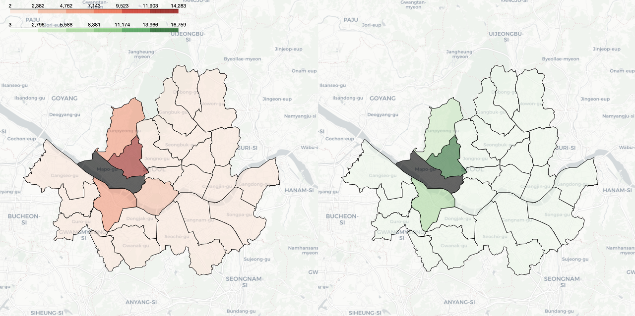 *_한편, 망원동, 신수동 등 20-30대들의 주 플레이스였던 곳에는 눈에 띄게 사용비율이 적음을 알 수 있다.