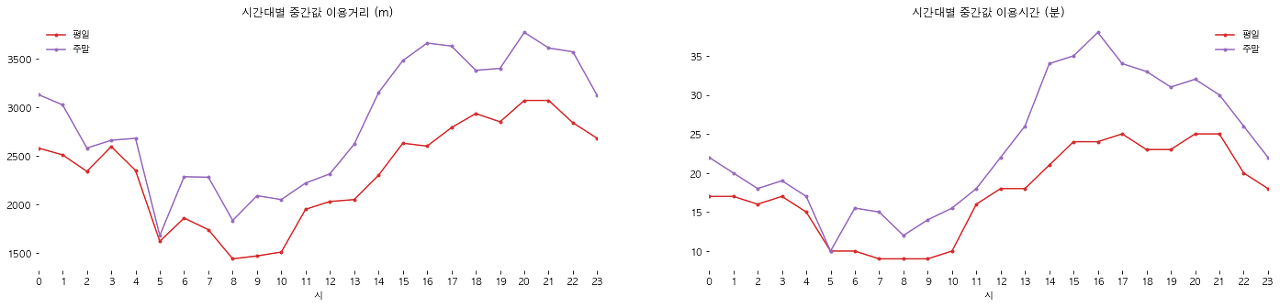 먼저 이용거리, 이용시간 둘다평일과 주말의 패턴이 크게 다르지 않음을 알 수 있다.