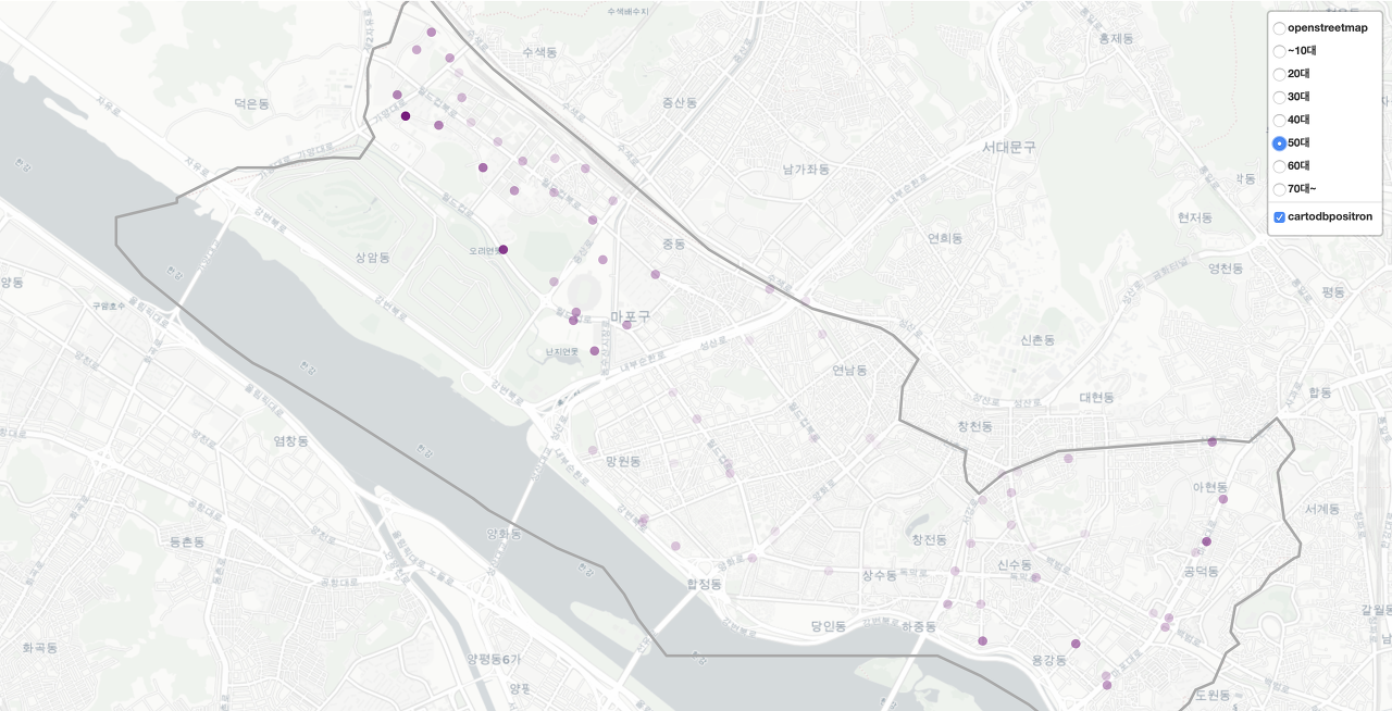 따라서, 연령대별로 비율이 높은 대여소들을 지도에 직접 시각화해서 봐보자.