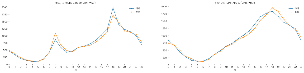 또한, 평일과 주말 모두 다, 16시 - 22시 사이에 이용량이 많은걸 볼 수 있다.